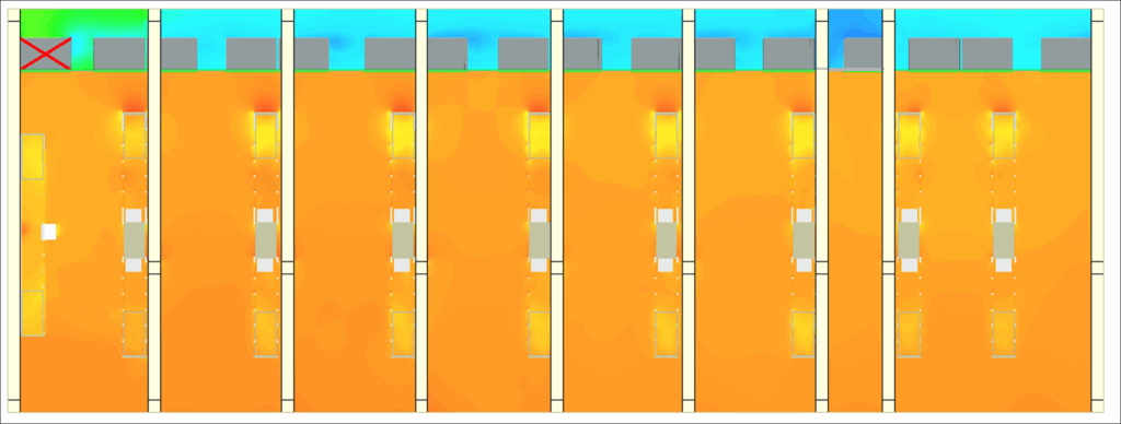 تُظهر خرائط الحرارة الناتجة عن المحاكاة بدقة المناطق المعرضة للخطر ويشمل ذلك ركود الحرارة في الجزء السفلي من الخليج، أو اختلال التوازن بين الممرات، أو زيادة موضعية في الضغط يمكن أن تؤدي إلى تنشيط نظام الحريق. حتى قبل أن يتم تشغيل البنوك، من الممكن تعديل وضع وحدات CRAH، أو تعديل تخطيط الشبكات أو تكييف تسلسل التدفئة.