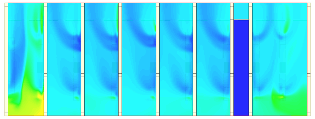 تمكّننا أدوات النمذجة العددية الخاصة بنا، وخاصةً طرق ديناميكيات الموائع الحسابية (CFD)، من تحليل التوزيع الدقيق لدرجات الحرارة وسرعات الهواء والضغط في الغرفة أثناء اختبار سرير التحميل. وبفضل هذا النهج، من الممكن تمثيل الأعمدة الحرارية ومناطق إعادة الدوران وتدرجات الضغط والتدفقات التي تسببها معدات الاختبار بيانياً.
