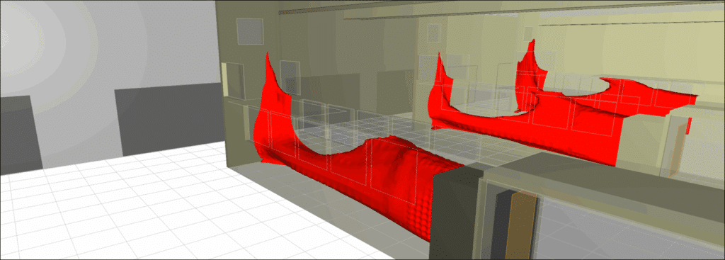 يمكن أن يتسبب تراكم الهواء الساخن في السقف أثناء الاختبارات في توقف نظام الرش بشكل غير متوقع. تستخدم EOLIOS محاكاة CFD لتحديد هذه المناطق الحرجة وتوصي بحلول مثل إضافة شبكات إضافية لضمان التحكم الحراري الفعال والآمن.